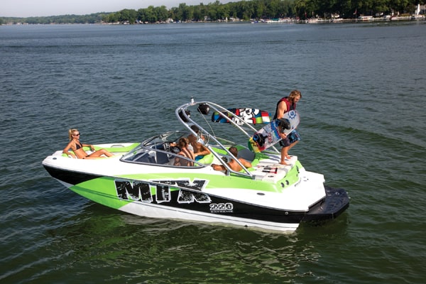 Dès que vous apercevez ce bateau, vous faites « Wow! ». Vous ne pouvez manquer les lettres MTX peintes en gros de chaque côté du bateau, le tout dans un agencement de couleurs attrayantes en blanc, noir et lime. De plus, il y a sa tour de wakeboard stylisée qui penche vers l’avant avec ses haut-parleurs et ses supports à planches. Tout ce que vous voyez fait partie de la version « Extreme ».