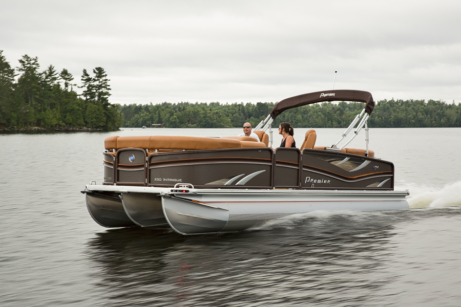 Le ponton Premier 270 Intrigue existe depuis plusieurs années, mais il a été complètement redessiné en 2017. Il est offert avec de nouvelles couleurs et il est au goût du jour. Un système de lumières DEL illumine l’extérieur du ponton ainsi que le plancher le soir venu. Le toit qui vous protège des intempéries se déploie automatiquement et non manuellement lorsque vous êtes à quai ou à une escale.