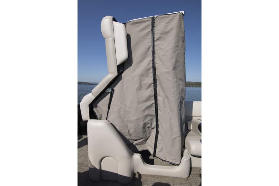 Un grand choix d’options est disponible pour personnaliser votre ponton selon vos besoins. Celui que nous avons testé était notamment doté d’un mât de remorquage en acier inoxydable pour les skieurs et amateurs de wakeboard (celui-ci est très important pour plus de sécurité dans l’espace moteur), d’une radio Clarion de 200 watts AM/FM/CD/Bluetooth, d’une housse d’amarrage taupe, d’un toit campeur complet et d’un coupe-batterie permettant la coupure complète du courant à bord. Le recouvrement de plancher était en vinyle « Sélect » (dans la version standard, il s’agit d’un tapis, mais la plateforme arrière est munie d’un vinyle standard).