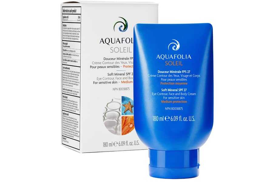 La gamme de produits Aquafolia SOLEIL offre une haute protection solaire à large spectre UVA et UVB pour tous les types de peau et de conditions cutanées. Celle-ci est 100 % hypoallergénique, antioxydante, 100 % minérale, sans filtre chimique, résistante à l’eau et à la sueur. L’équipe de Québec Yachting a essayé la protection moyenne Douceur Minérale FPS 27 qui convient au contour des yeux, au visage et au corps. Celle-ci est crémeuse et vous devez bien la faire pénétrer afin de faire disparaître le film blanc sur votre peau. La crème peut être utilisée par les personnes aux peaux fragiles, sensibles et réactives.
