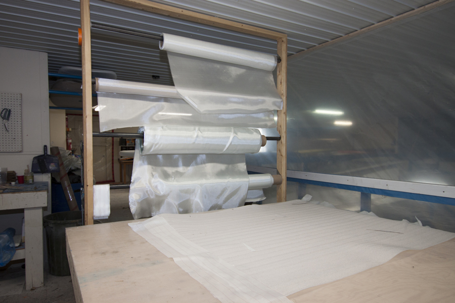 - Du fibre de verre, du kevlar ou du carbone sera étendu sur le styromousse (laminage) et le tout sera enduit d’époxy, puis sablé.