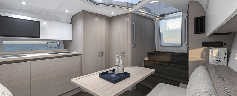 Le pont inférieur offre un niveau de confort idéal pour la croisière. Outre la cuisine et la salle d’eau, on trouve deux cabines privatives dont chacune dispose de lits dans l’axe du bateau pour une habitabilité optimale. Leur conception pleine largeur associée aux vitrages ouvrants rendent ces espaces particulièrement accueillants et agréables. Quant à l’ambiance intérieure, elle se veut moderne tout en appelant à la sérénité grâce aux essences de noyer gris, raffiné et lumineux.