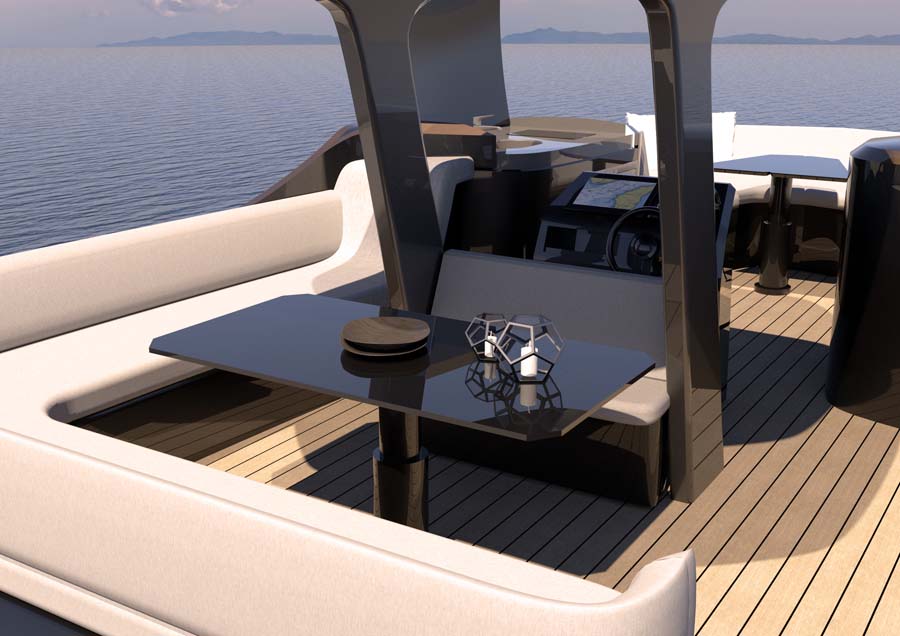 À l’avant du Voltaire 33 SKY, vous trouverez une table qui s’abaisse avec une banquette en U. Cet espace se transforme en bain de soleil de 3,5 m x 1,8 m (11 pi 6 po x 5 pi 11 po ). À l’arrière, il y a une autre table avec une banquette en L ainsi qu’une porte pour naviguer en toute sécurité. Ces deux zones peuvent être recouvertes d’un grand pare-soleil. À tribord, il y a une toilette avec un lavabo et à bâbord, un espace cuisine avec un évier et un réfrigérateur. Vous pouvez y ajouter une machine à café ou un barbecue au gaz. Un panneau solaire de 600 Wp peut être intégré au toit en T. Fabriqué en fibre de lin avec résine d’époxy bio, son isolation s’en trouve renforcée, tout comme son étanchéité, un gage d’une production de bateaux plus propre avec un matériel durable.