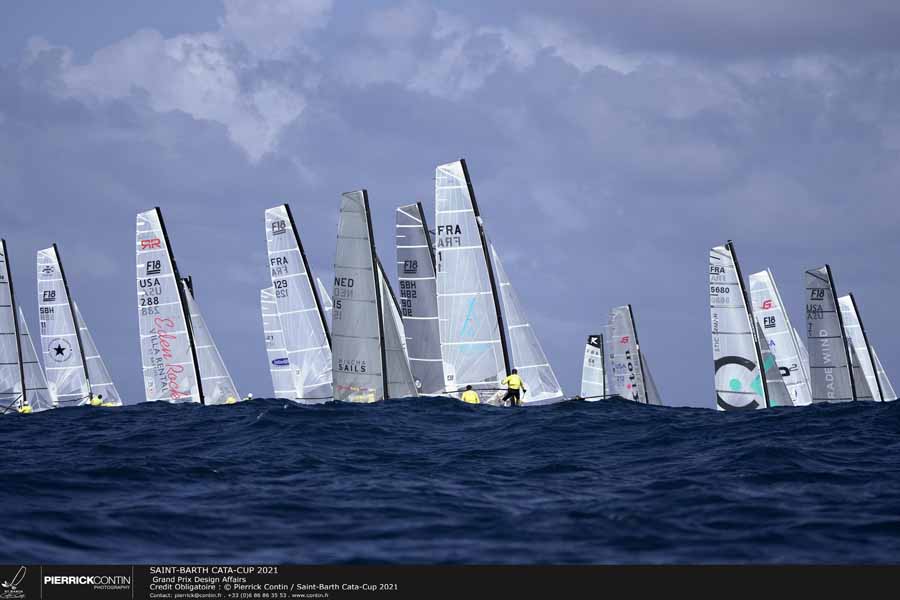 La 13e édition de la Saint-Barth Cata-Cup a débuté sur les chapeaux de roues, le jeudi 17 novembre 2021. Les 65 équipages en lice ont, en effet, démarré l’épreuve dans des conditions toniques, avec entre 18 et 20 nœuds de vent très rafaleux sur une mer formée. Des conditions techniques qui ont naturellement favorisé les gros bras de la série mais qui ont aussi régulièrement redistribué les cartes et brassé la flotte. Pour preuve, à l’issue des deux premières courses disputées, le duo Gurvan Bontemps – Benjamin Amiot (Stickerman) remporte le prix « Design Affairs-001 » et s’installe du même coup en tête du classement général provisoire sans avoir gagné une manche.