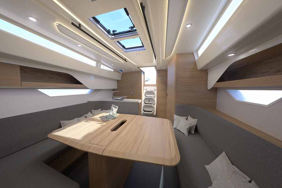 Derrière sa belle façade, l’E6 est destiné à être le cruiser de production de 47 pieds le plus rapide, le plus léger et le plus rigide du marché avec un intérieur entièrement équipé. Un contributeur important à cela est la célèbre architecture navale de Humphreys Yacht Design, car ils ont développé une toute nouvelle coque pour répondre aux besoins de l’E6. Différents candidats de forme de coque sont passés par une modélisation et une analyse approfondies de la CFD (mécanique des fluides numérique) pour évaluer celle qui fonctionnerait le mieux pour les besoins de l’E6. Les résultats ont été évalués et comparés via le VPP (programmes de prédiction de vitesse) pour affiner la coque. Les yachts E-Line d’Elan sont réputés pour leurs excellentes performances par brise fraîche, en particulier au portant, mais les résultats de cette coque de nouvelle génération devraient également être rapides dans le petit temps, en raison de son rapport surface de voilure/déplacement particulièrement élevé. Dans le même temps, la polyvalence des coques couvre une gamme de déplacements pour également répondre aux personnes nécessitant de plus grandes capacités de charge.