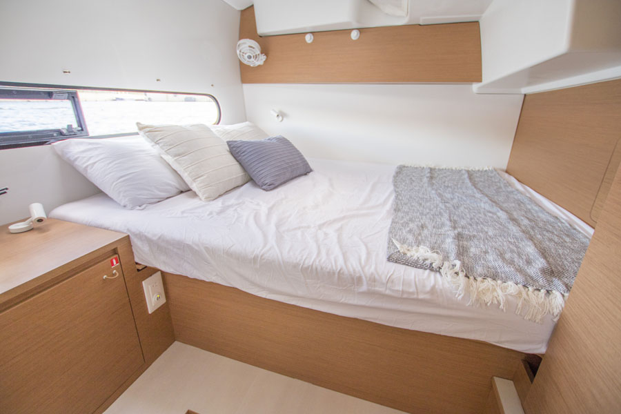 Quant au cockpit avant, vous y trouverez un trampoline avec un filet en nylon gris séparé au milieu, une grande zone de bain de soleil et deux grands coffres de rangement ainsi qu’un accès technique.