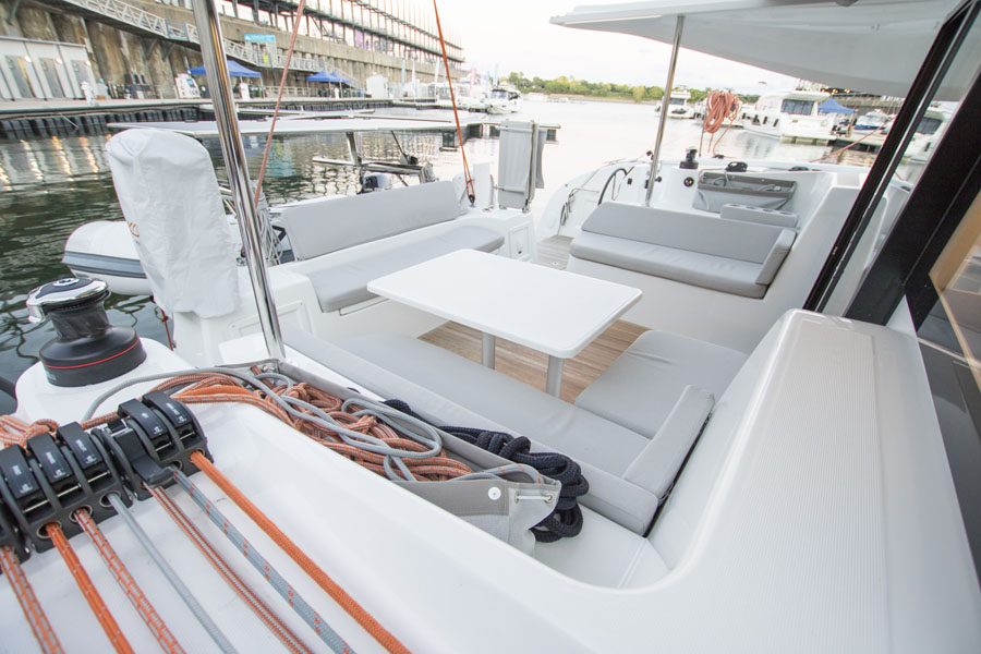 Le dimanche 26 septembre, après le Bateau à flot, Québec Yachting a eu la chance de monter à bord pour vivre une expérience dans le Vieux-Port de Montréal. Les voiles ont été hissées près du quai Alexandra, non loin du Bota Bota, spa-sur-l’eau, puis nous avons passé à voile devant la Tour de l’horloge, sous le pont Jacques-Cartier et devant La Ronde située sur l’île Sainte-Hélène. Très stable grâce à ses deux coques en sandwich balsa, il ne gîte pas. Son gréement sportif s’inspire de la course, même si le voilier est destiné à la croisière. Les manœuvres sont simplifiées grâce à des chandeliers et des taquets en aluminium de style titane ainsi que des câbles de direction en Dyneema pour améliorer la réactivité et la sensibilité du toucher de barre.
