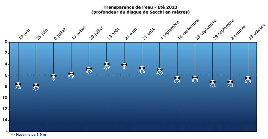 On remarque que la transparence de ces deux lacs a décliné considérablement en période d’activité nautique en 2023. Cette tendance a été observée sur plusieurs années.