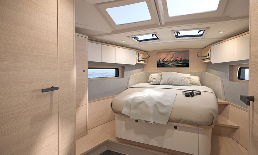 Le salon du Dufour 44 est conçu pour la convivialité. La table hexagonale innovante peut accueillir jusqu’à 10 personnes grâce à ses sièges amovibles. La cabine du propriétaire à l’avant bénéficie d’un lit Island Bed et d’une salle d’eau indépendante, pour plus d’intimité et de confort. Une grande attention a été portée au volume des espaces et le choix des matériaux.