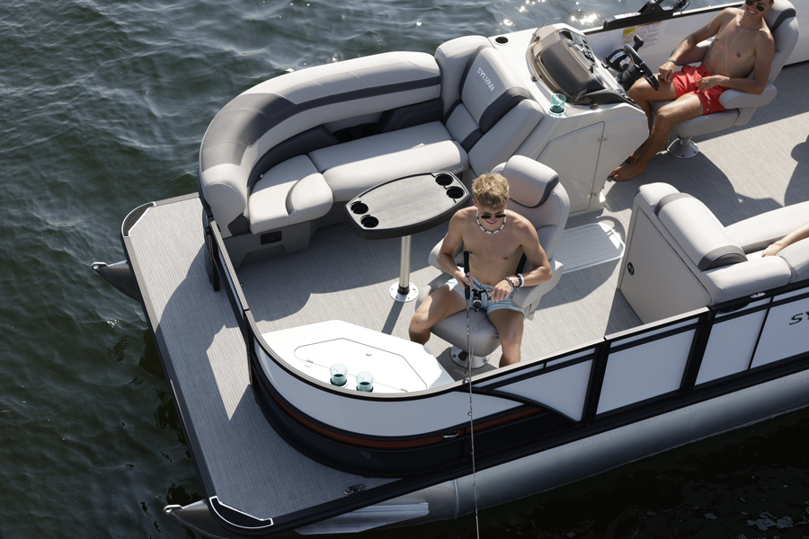 La série L de Sylvan regroupe pas moins de 19 modèles! Le L3 Party Fish de 24 pieds 8 pouces (7,51 mètres) avec l’ensemble Port Fish est prêt pour que vous puissiez vous amuser sur l’eau. Il comprend notamment un toit bimini électrique, deux sièges de barre à dossier haut, un rail extérieur enveloppant avec un pôle intégré pour pratiquer le ski nautique et des postes de pêche à l’avant et à l’arrière avec des viviers. L’ajout de l’ensemble Port Fish remplace le banc de proue à bâbord par un fauteuil de pilotage à haut dossier et un vivier. La motorisation maximale est de 300 ch, la capacité maximale est de 12 personnes (1650 lb) à bord et vous pouvez remplir le réservoir d’essence jusqu’à 60 gallons. Ajoutez des plateaux pour ranger vos leurres, des porte-cannes et une superbe chaîne stéréo et vous serez prêt à créer des souvenirs inoubliables.