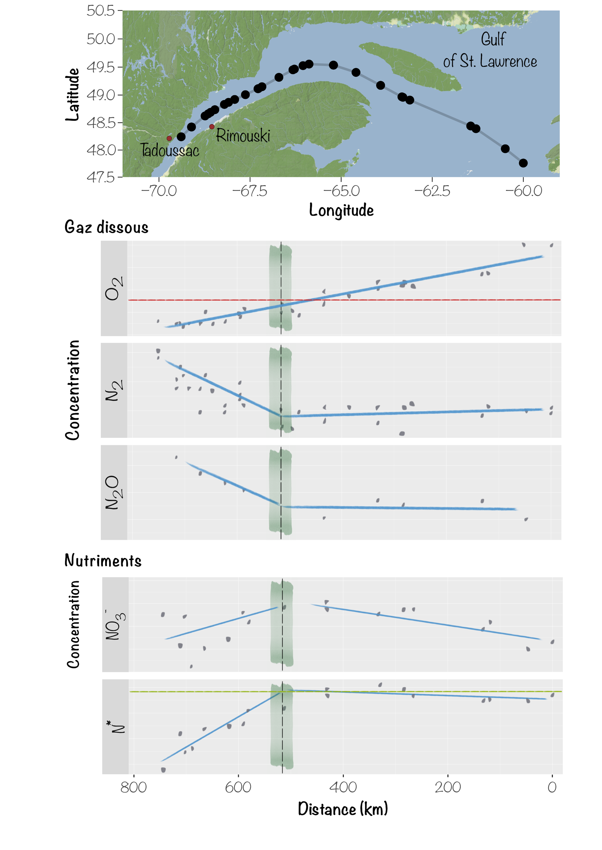 Mais ce n’est pas tout : sous ce même seuil, nous avons également observé une production de protoxyde d’azote (N2O), un gaz à effet de serre (GES) 300 fois plus puissant que le CO2 en termes de réchauffement global. Or, dans le Saint-Laurent, les eaux profondes remontent naturellement vers la surface près de Tadoussac, poussées par la circulation des masses d’eau de l’estuaire et les marées. Cette remontée d’eaux riche en N2O transforme l’estuaire en une zone potentielle d’émission de GES vers l’atmosphère, montrant clairement le lien entre la désoxygénation des eaux profondes, le cycle de l’azote et le climat.